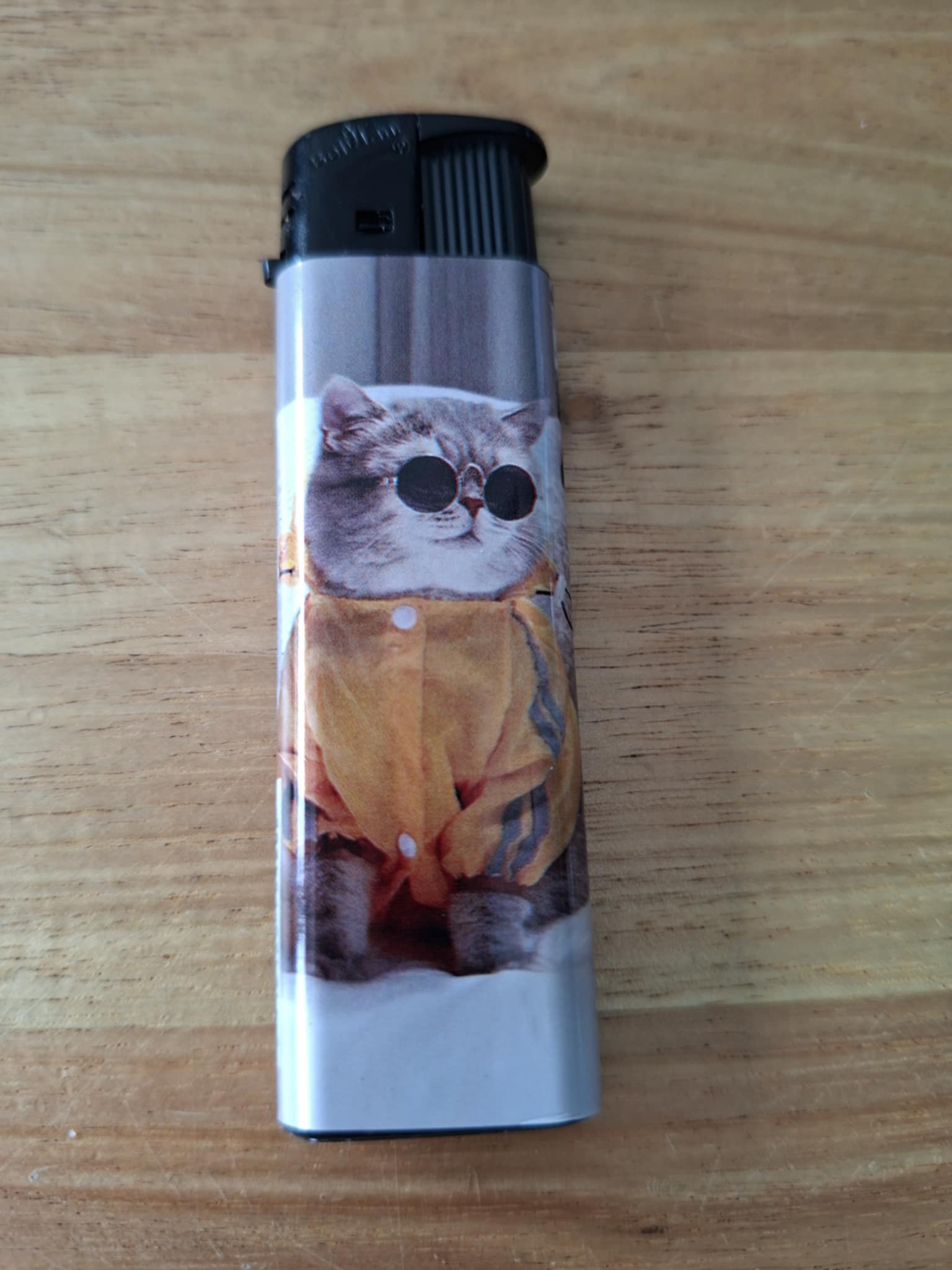 Aansteker - kat donkere bril en fleecetrui