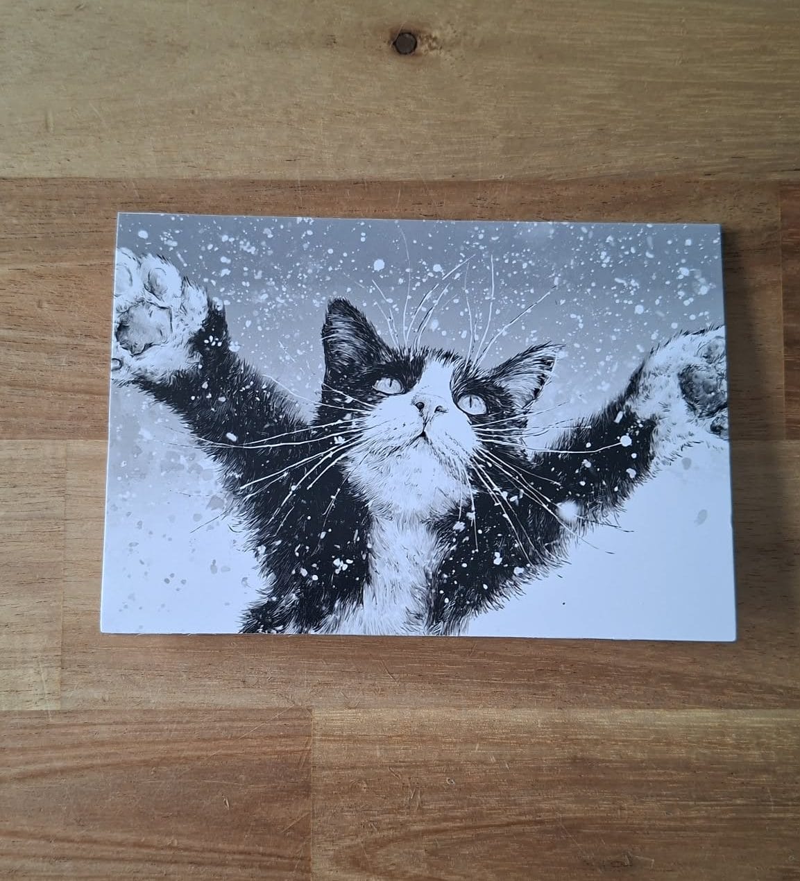 Gevouwen kerstkaart – zwartwitte kat in de sneeuw 1