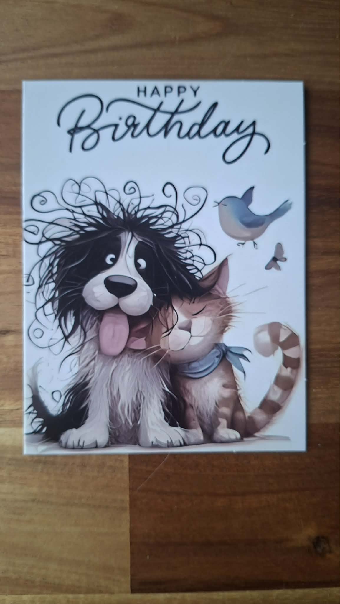Leuke verjaardagskaart met een kat en hond als onderwerp. Ideaal voor de dierenvriend!