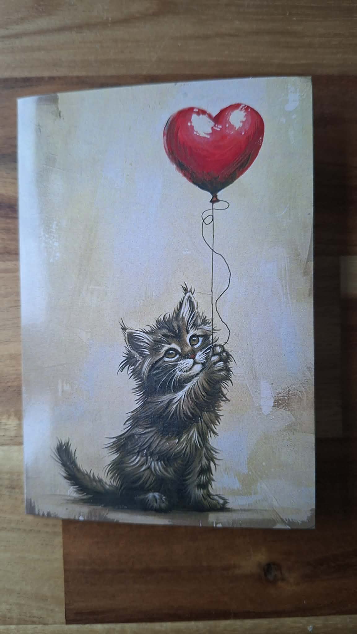 Leuke wenskaart van een katje met een hartjesballon. Valentijnskaart of gewoon iemand een hart 😉 onder de riem steken? Het kan allemaal!